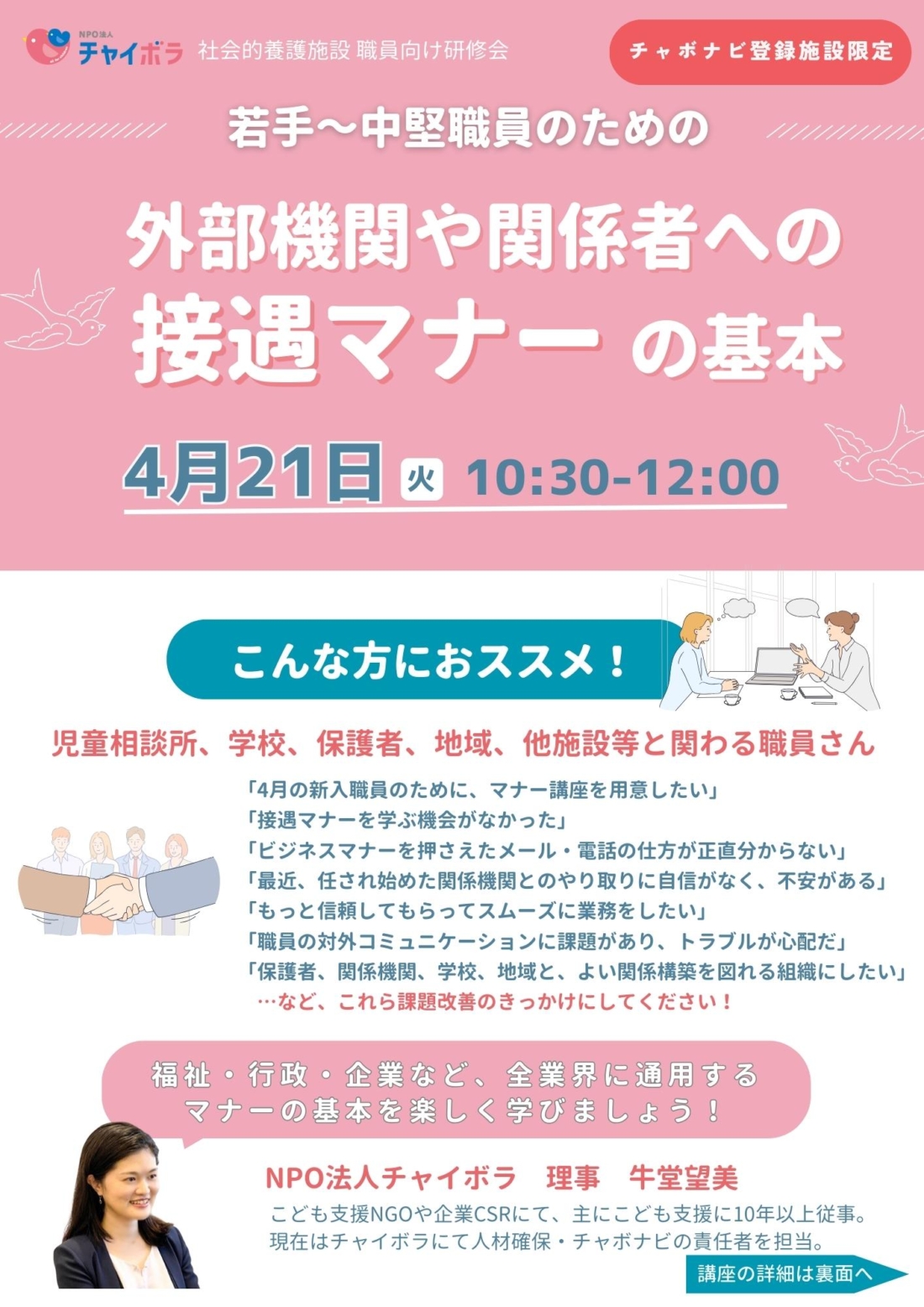 【施設向け研修】若手~中堅職員のための、外部機関や関係者への接遇マナーの基本
